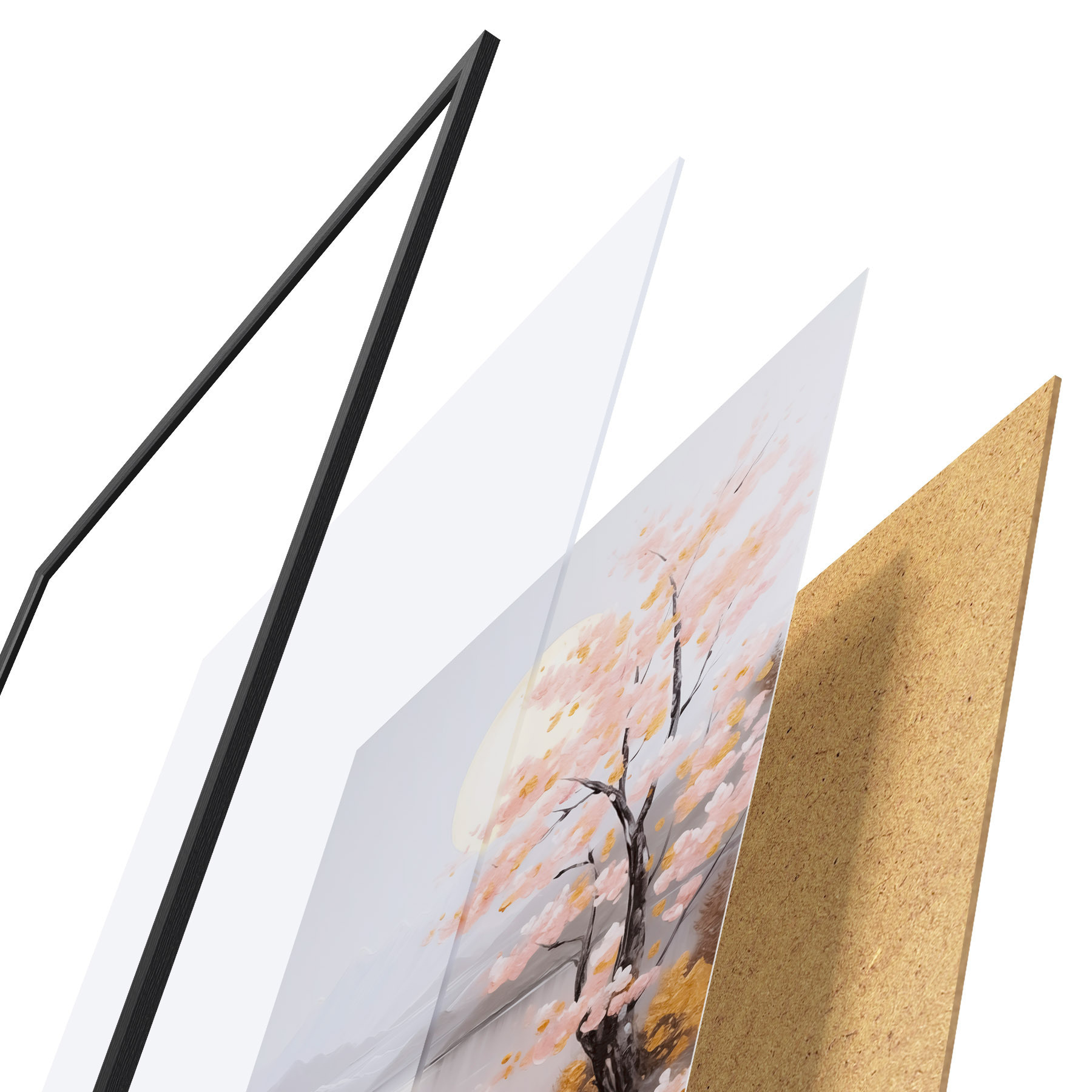 Plagát sa skladá z rámu, plexiskla, vytlačeného obrazu a podkladu z drevotriesky. Plagát možno okamžite zavesiť na stenu vďaka úchytom na zadnej strane.