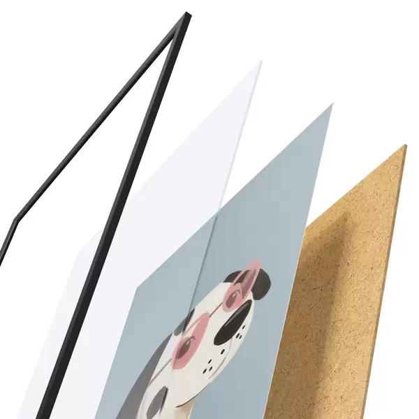 Plagát sa skladá z rámu, plexiskla, vytlačeného obrazu a podkladu z drevotriesky. Plagát možno okamžite zavesiť na stenu vďaka úchytom na zadnej strane.