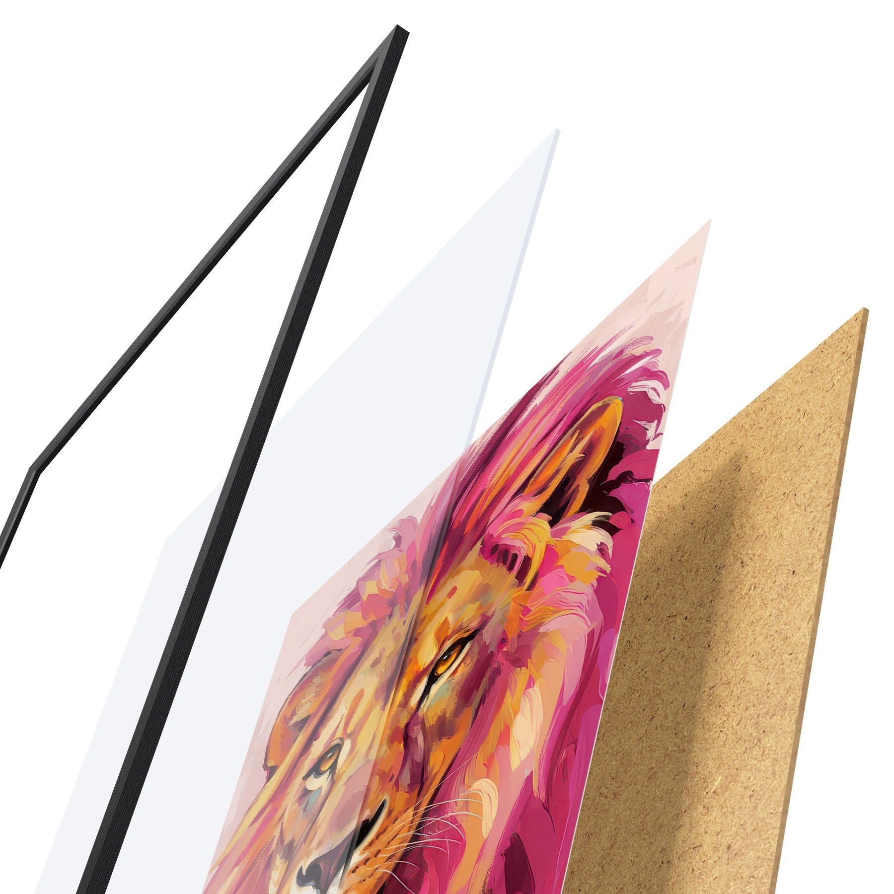 Plagát sa skladá z rámu, plexiskla, vytlačeného obrazu a podkladu z drevotriesky. Plagát možno okamžite zavesiť na stenu vďaka úchytom na zadnej strane.