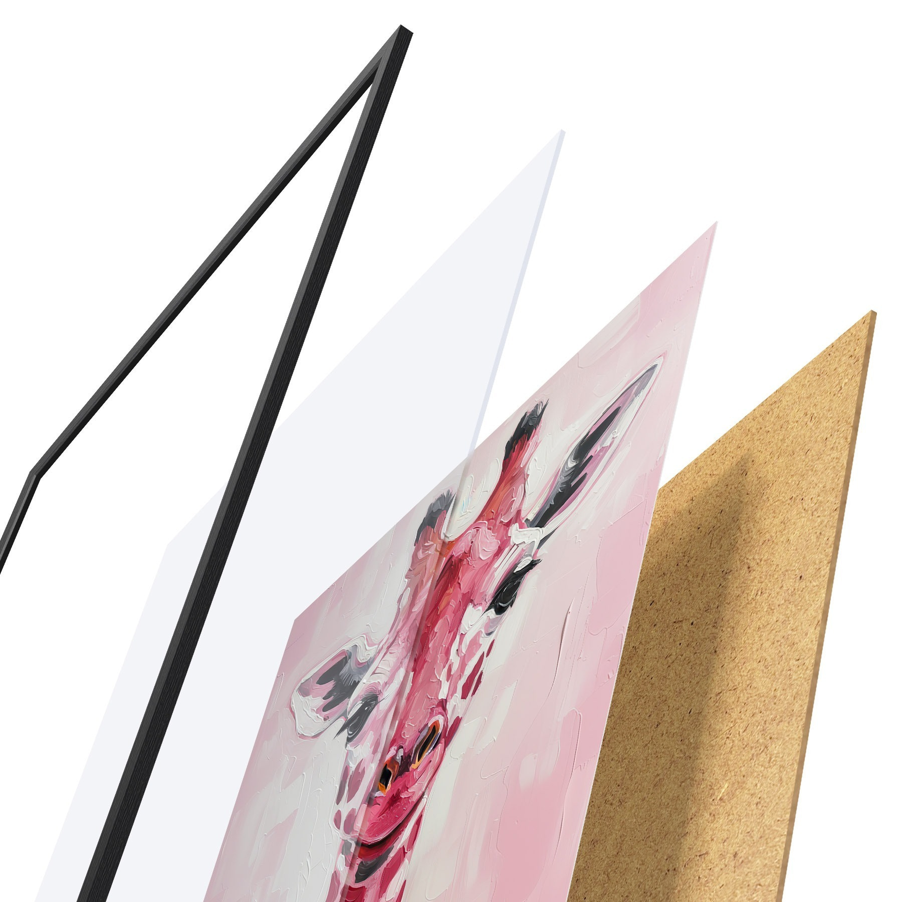 Plagát sa skladá z rámu, plexiskla, vytlačeného obrazu a podkladu z drevotriesky. Plagát možno okamžite zavesiť na stenu vďaka úchytom na zadnej strane.