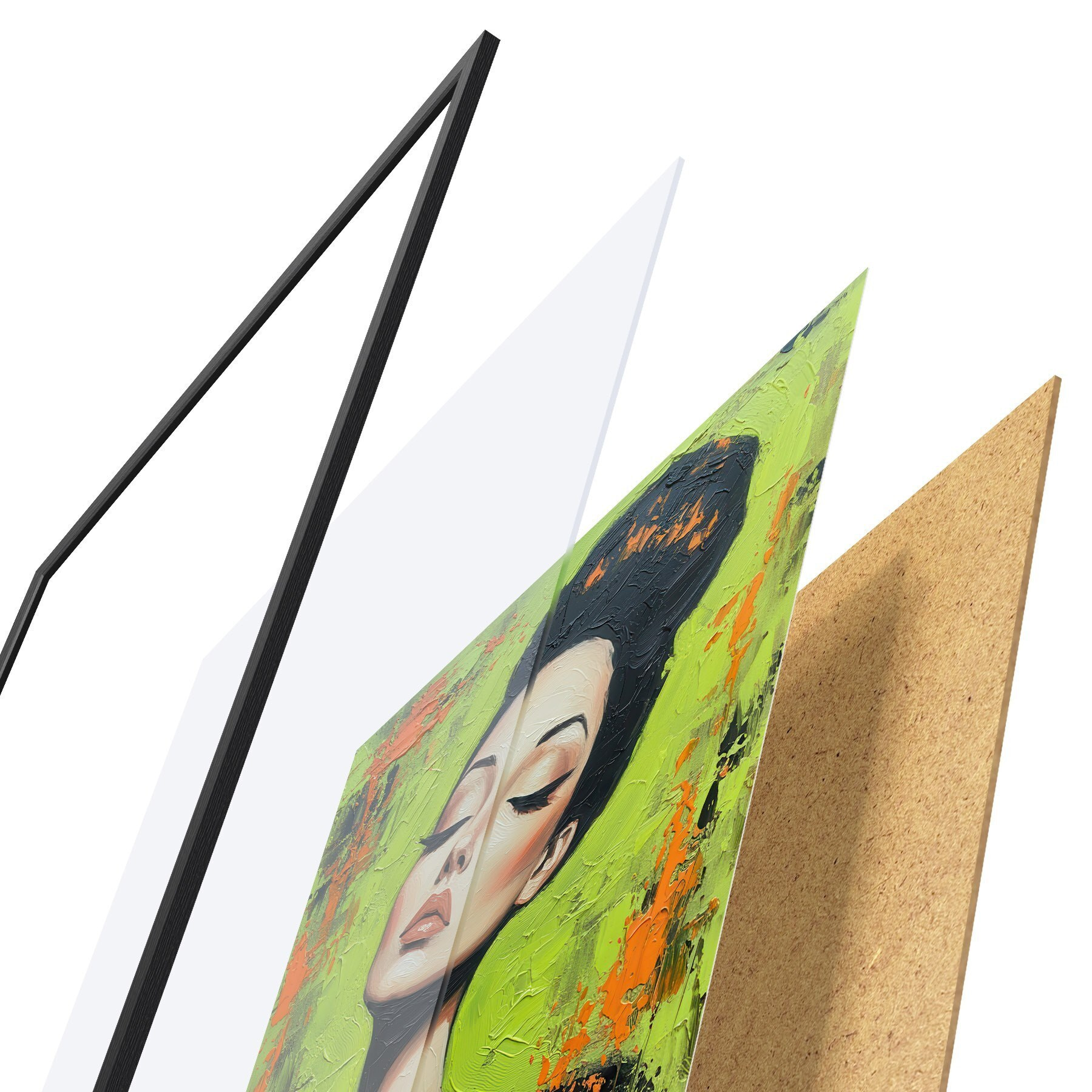 Plagát sa skladá z rámu, plexiskla, vytlačeného obrazu a podkladu z drevotriesky. Plagát možno okamžite zavesiť na stenu vďaka úchytom na zadnej strane.