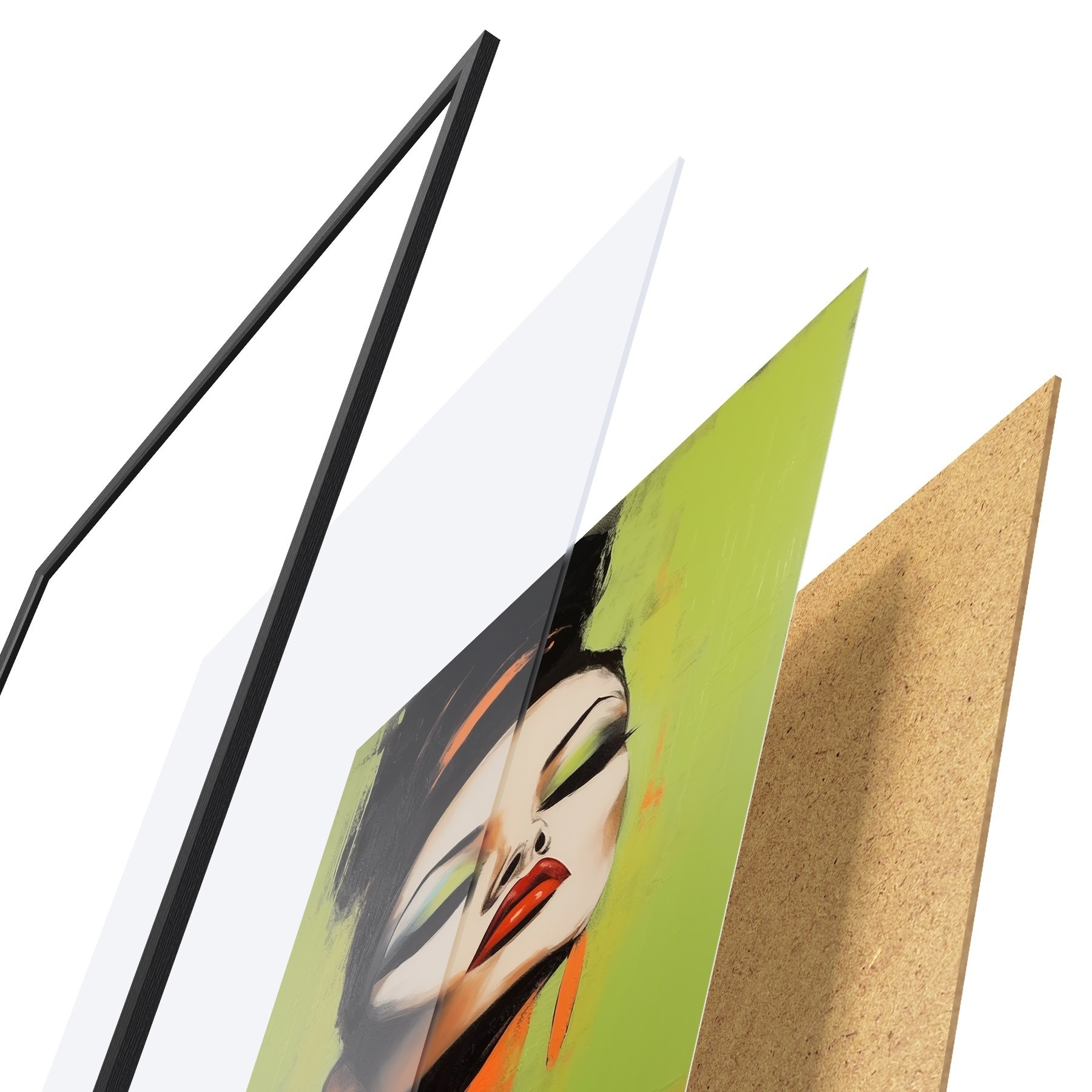 Plagát sa skladá z rámu, plexiskla, vytlačeného obrazu a podkladu z drevotriesky. Plagát možno okamžite zavesiť na stenu vďaka úchytom na zadnej strane.