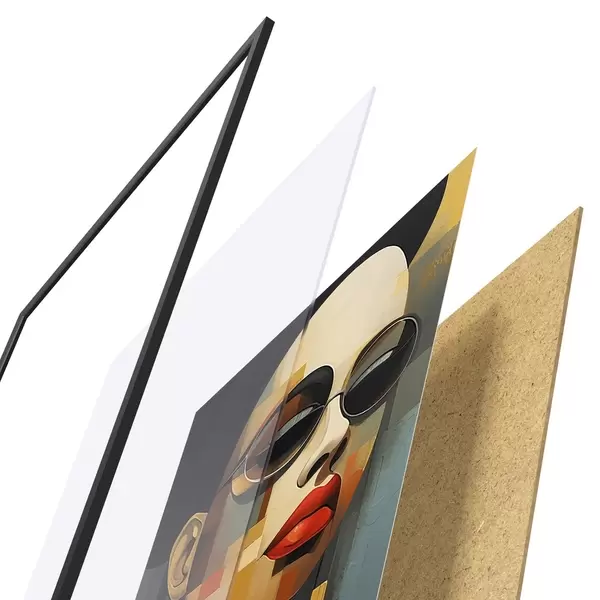 Plagát sa skladá z rámu, plexiskla, vytlačeného obrazu a podkladu z drevotriesky. Plagát možno okamžite zavesiť na stenu vďaka úchytom na zadnej strane.