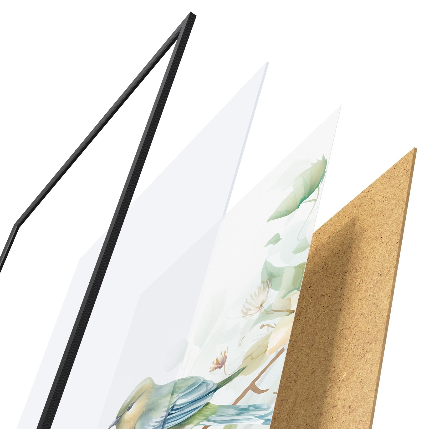 Plagát sa skladá z rámu, plexiskla, vytlačeného obrazu a podkladu z drevotriesky. Plagát možno okamžite zavesiť na stenu vďaka úchytom na zadnej strane.