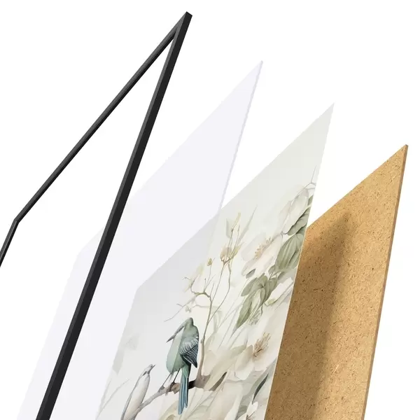 Plagát sa skladá z rámu, plexiskla, vytlačeného obrazu a podkladu z drevotriesky. Plagát možno okamžite zavesiť na stenu vďaka úchytom na zadnej strane.