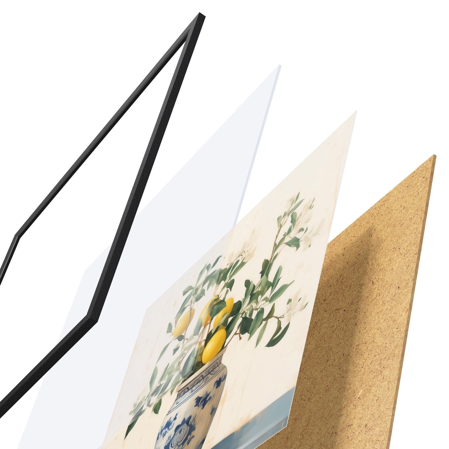 Plagát sa skladá z rámu, plexiskla, vytlačeného obrazu a podkladu z drevotriesky. Plagát možno okamžite zavesiť na stenu vďaka úchytom na zadnej strane.