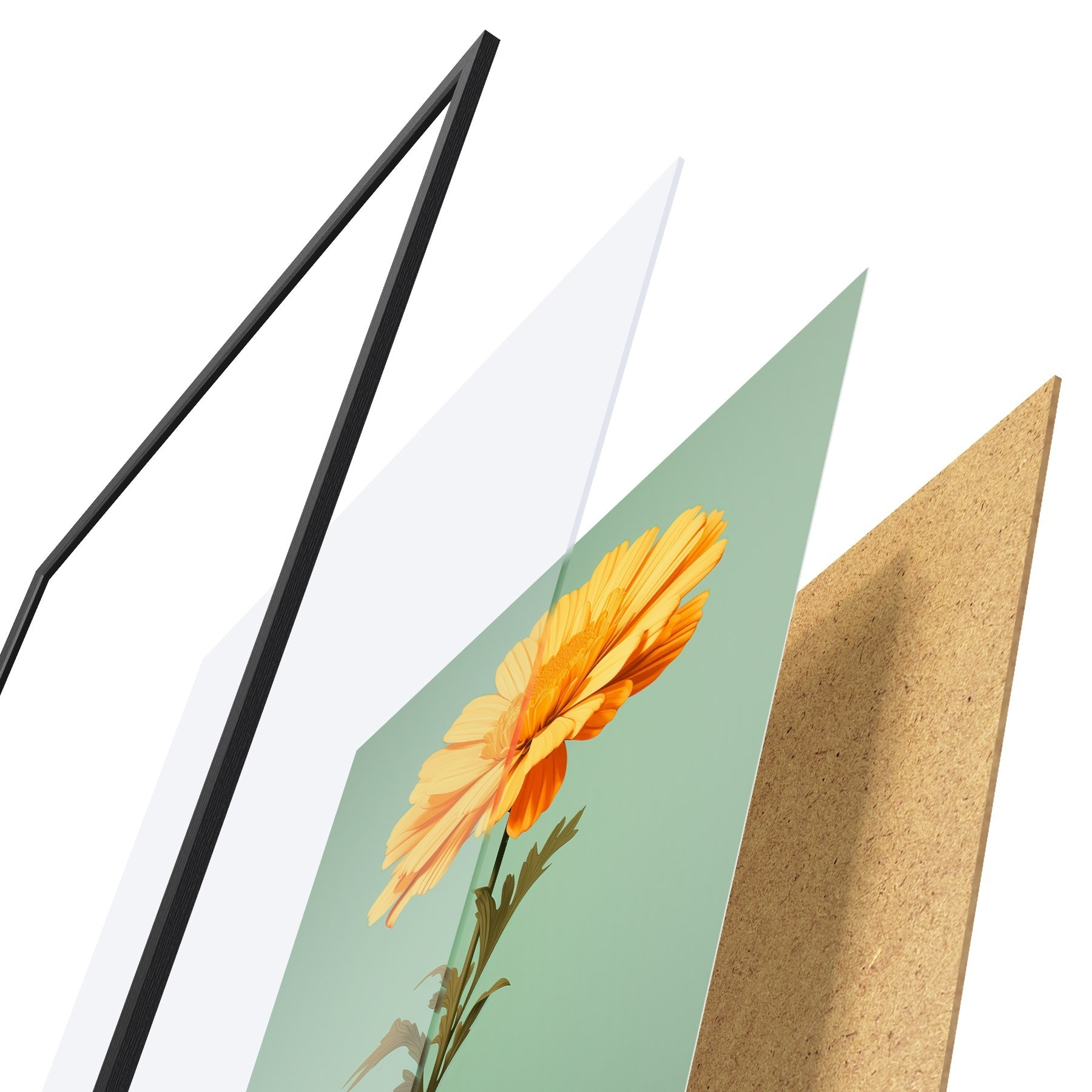 Plagát sa skladá z rámu, plexiskla, vytlačeného obrazu a podkladu z drevotriesky. Plagát možno okamžite zavesiť na stenu vďaka úchytom na zadnej strane.