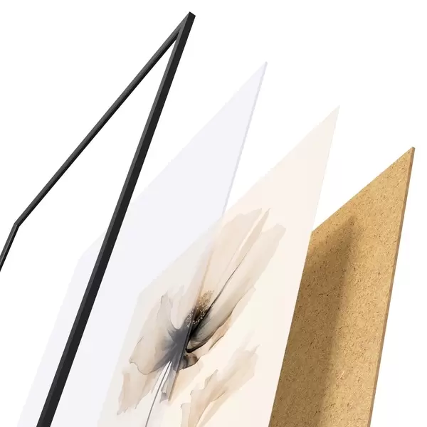 Plagát sa skladá z rámu, plexiskla, vytlačeného obrazu a podkladu z drevotriesky. Plagát možno okamžite zavesiť na stenu vďaka úchytom na zadnej strane.