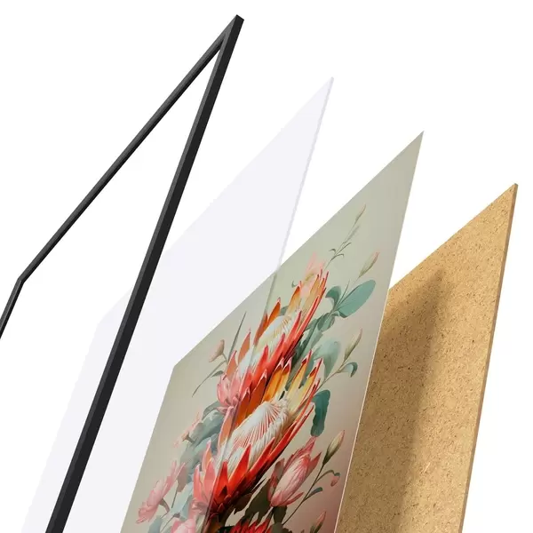 Plagát sa skladá z rámu, plexiskla, vytlačeného obrazu a podkladu z drevotriesky. Plagát možno okamžite zavesiť na stenu vďaka úchytom na zadnej strane.