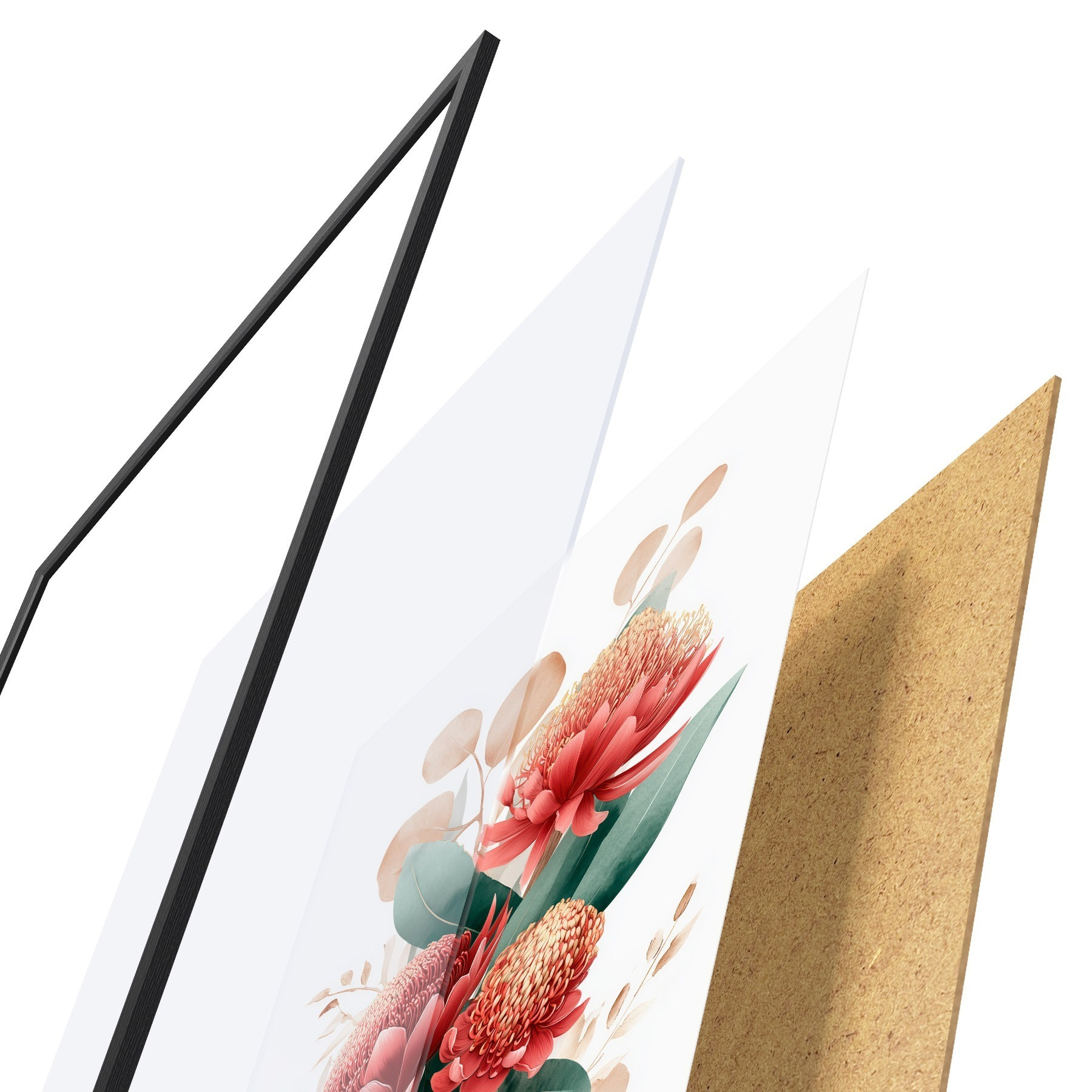 Plagát sa skladá z rámu, plexiskla, vytlačeného obrazu a podkladu z drevotriesky. Plagát možno okamžite zavesiť na stenu vďaka úchytom na zadnej strane.