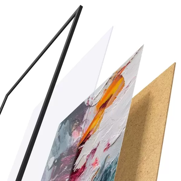 Plagát sa skladá z rámu, plexiskla, vytlačeného obrazu a podkladu z drevotriesky. Plagát možno okamžite zavesiť na stenu vďaka úchytom na zadnej strane.