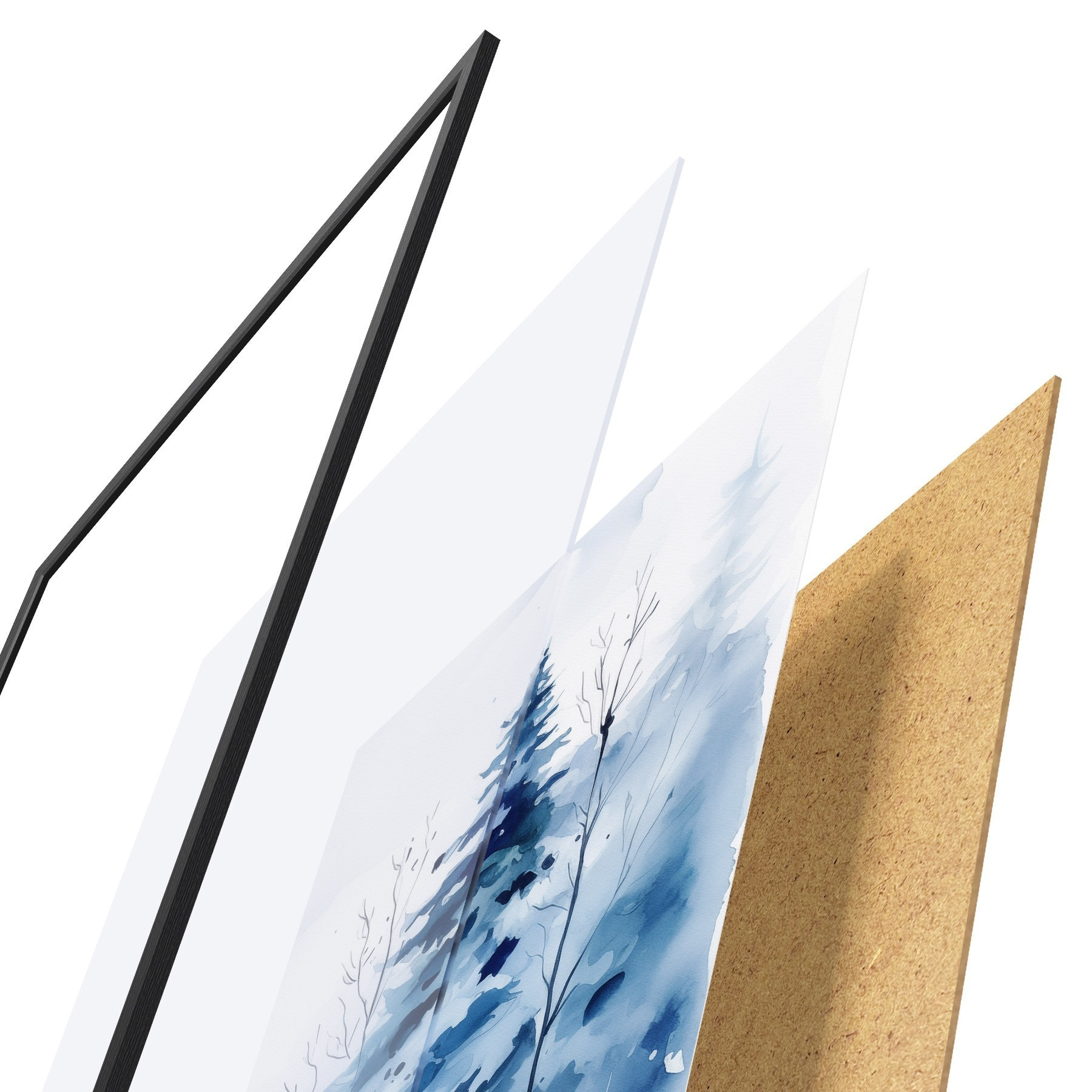 Plagát sa skladá z rámu, plexiskla, vytlačeného obrazu a podkladu z drevotriesky. Plagát možno okamžite zavesiť na stenu vďaka úchytom na zadnej strane.