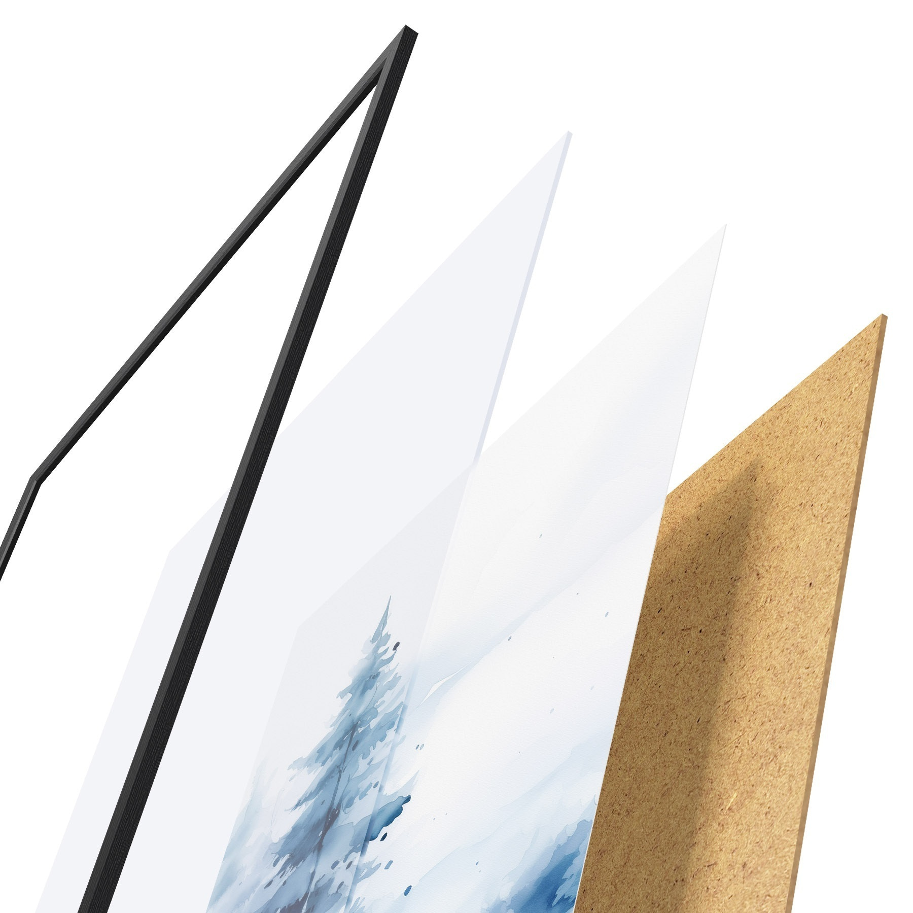 Plagát sa skladá z rámu, plexiskla, vytlačeného obrazu a podkladu z drevotriesky. Plagát možno okamžite zavesiť na stenu vďaka úchytom na zadnej strane.