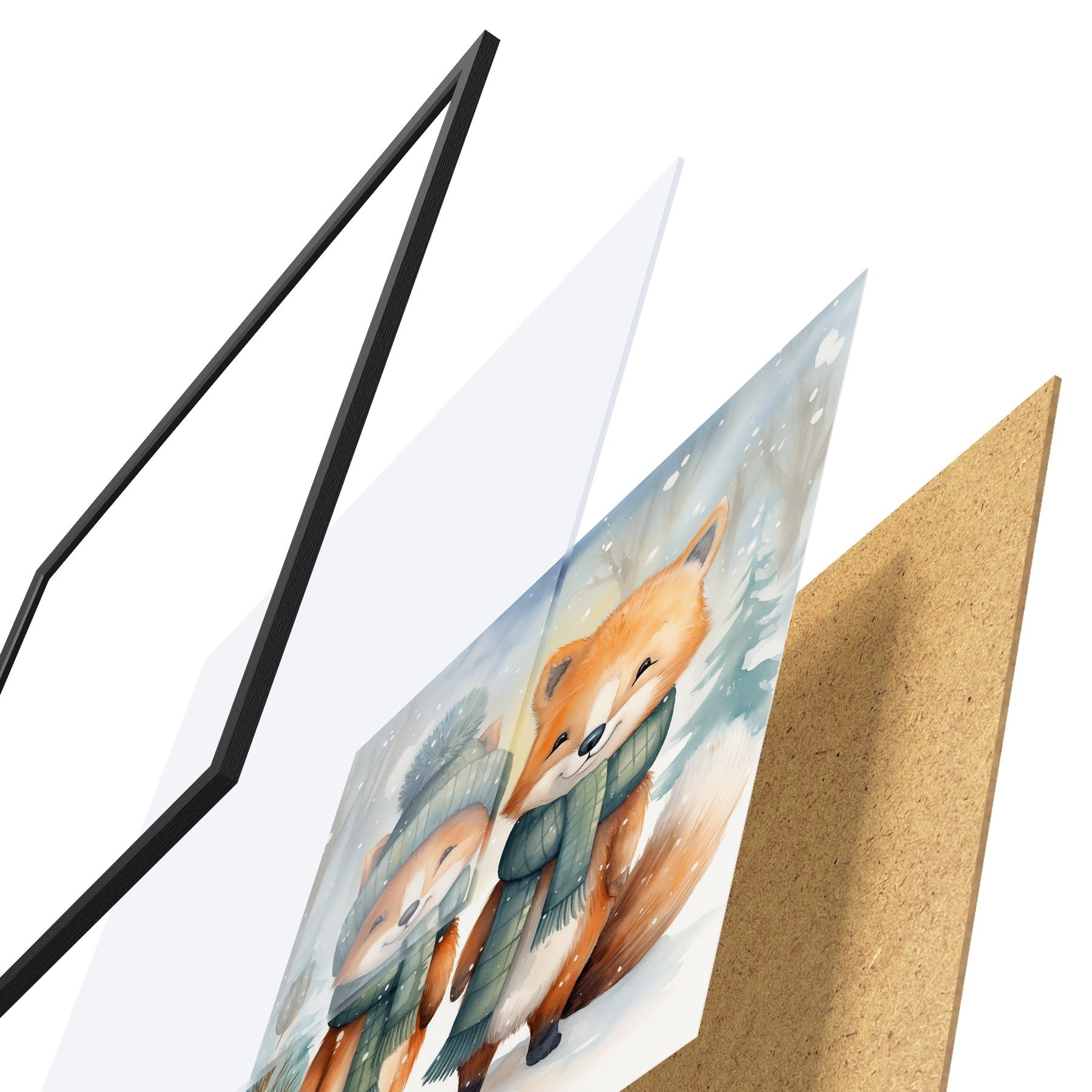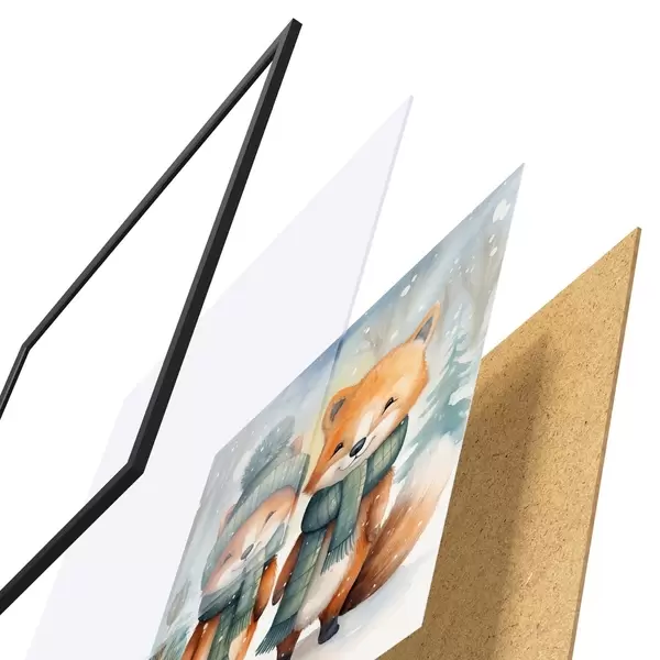 Plagát sa skladá z rámu, plexiskla, vytlačeného obrazu a podkladu z drevotriesky. Plagát možno okamžite zavesiť na stenu vďaka úchytom na zadnej strane.