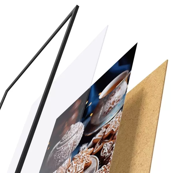 Plagát sa skladá z rámu, plexiskla, vytlačeného obrazu a podkladu z drevotriesky. Plagát možno okamžite zavesiť na stenu vďaka úchytom na zadnej strane.