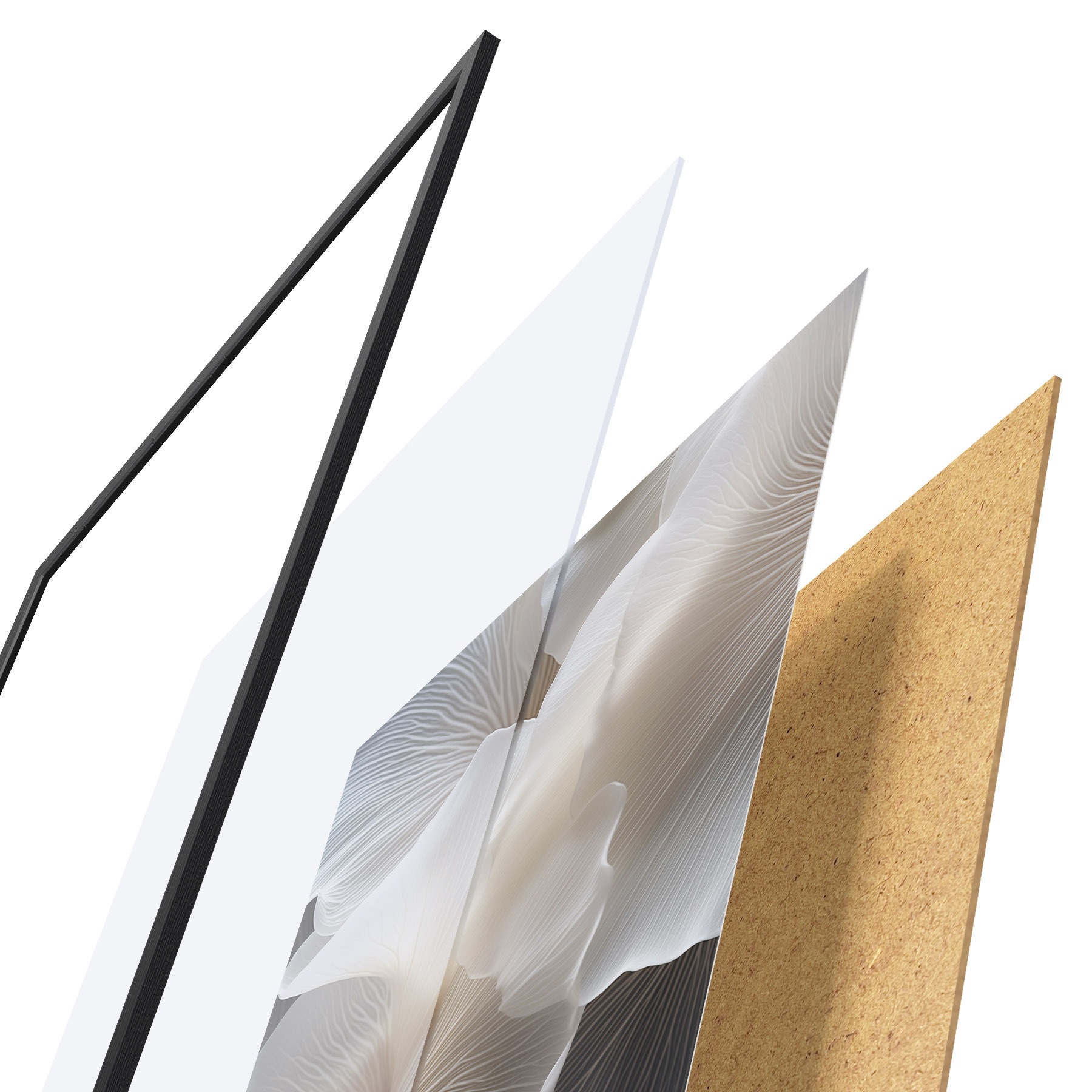 Plagát sa skladá z rámu, plexiskla, vytlačeného obrazu a podkladu z drevotriesky. Plagát možno okamžite zavesiť na stenu vďaka úchytom na zadnej strane.