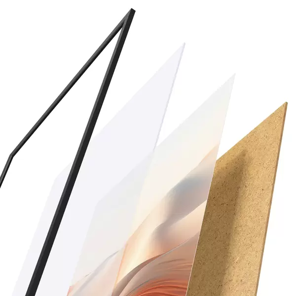 Plagát sa skladá z rámu, plexiskla, vytlačeného obrazu a podkladu z drevotriesky. Plagát možno okamžite zavesiť na stenu vďaka úchytom na zadnej strane.