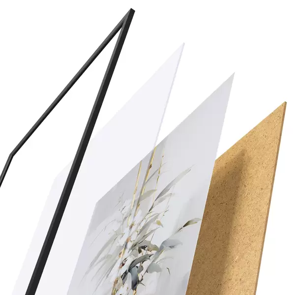 Plagát sa skladá z rámu, plexiskla, vytlačeného obrazu a podkladu z drevotriesky. Plagát možno okamžite zavesiť na stenu vďaka úchytom na zadnej strane.