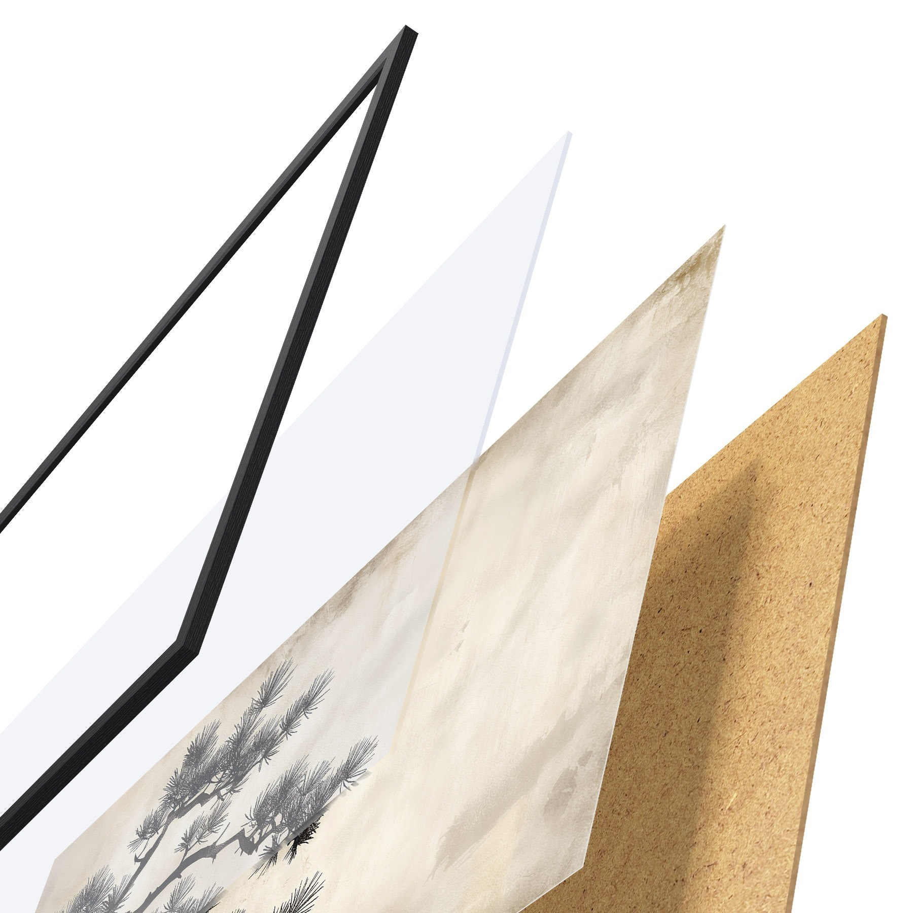 Plagát sa skladá z rámu, plexiskla, vytlačeného obrazu a podkladu z drevotriesky. Plagát možno okamžite zavesiť na stenu vďaka úchytom na zadnej strane.