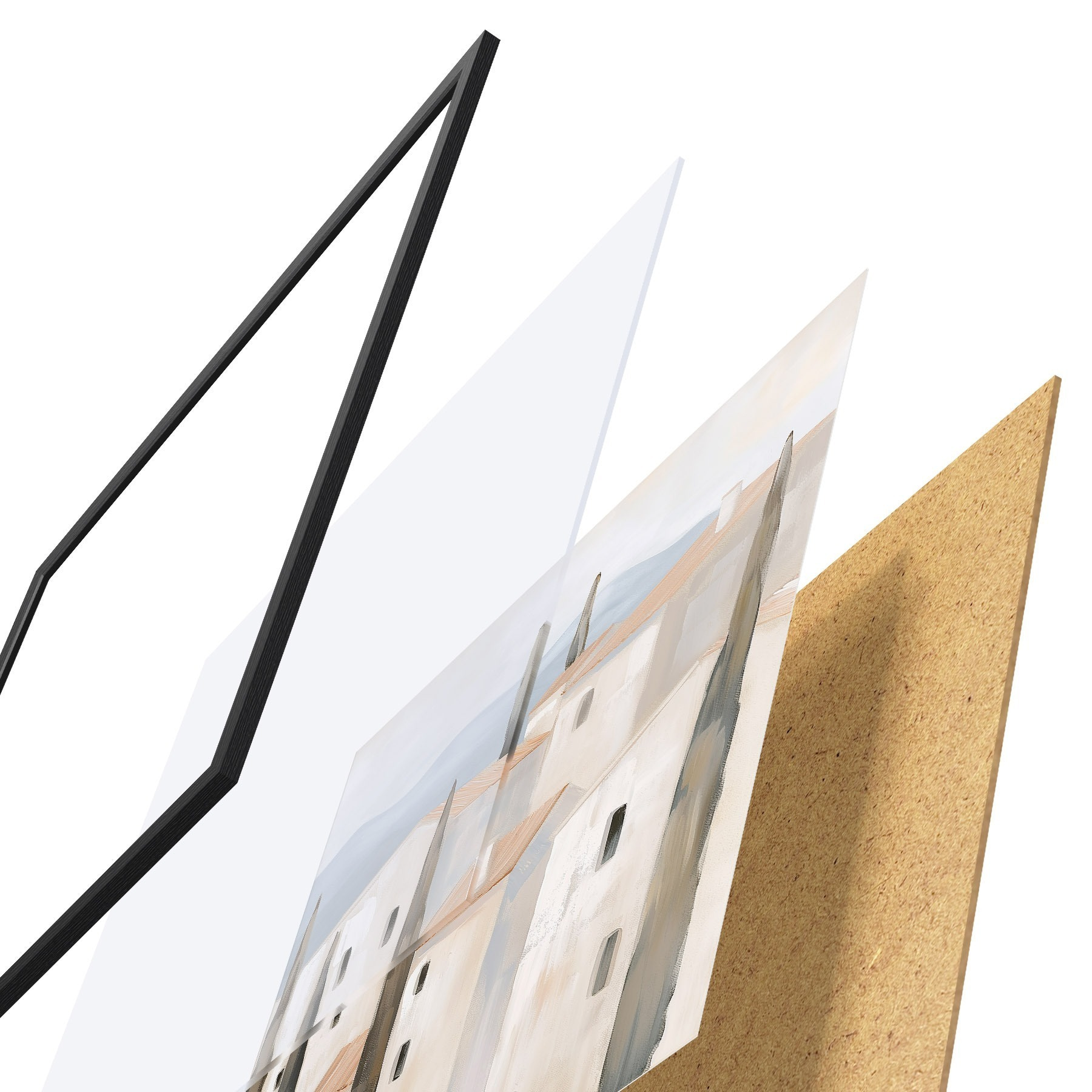 Plagát sa skladá z rámu, plexiskla, vytlačeného obrazu a podkladu z drevotriesky. Plagát možno okamžite zavesiť na stenu vďaka úchytom na zadnej strane.