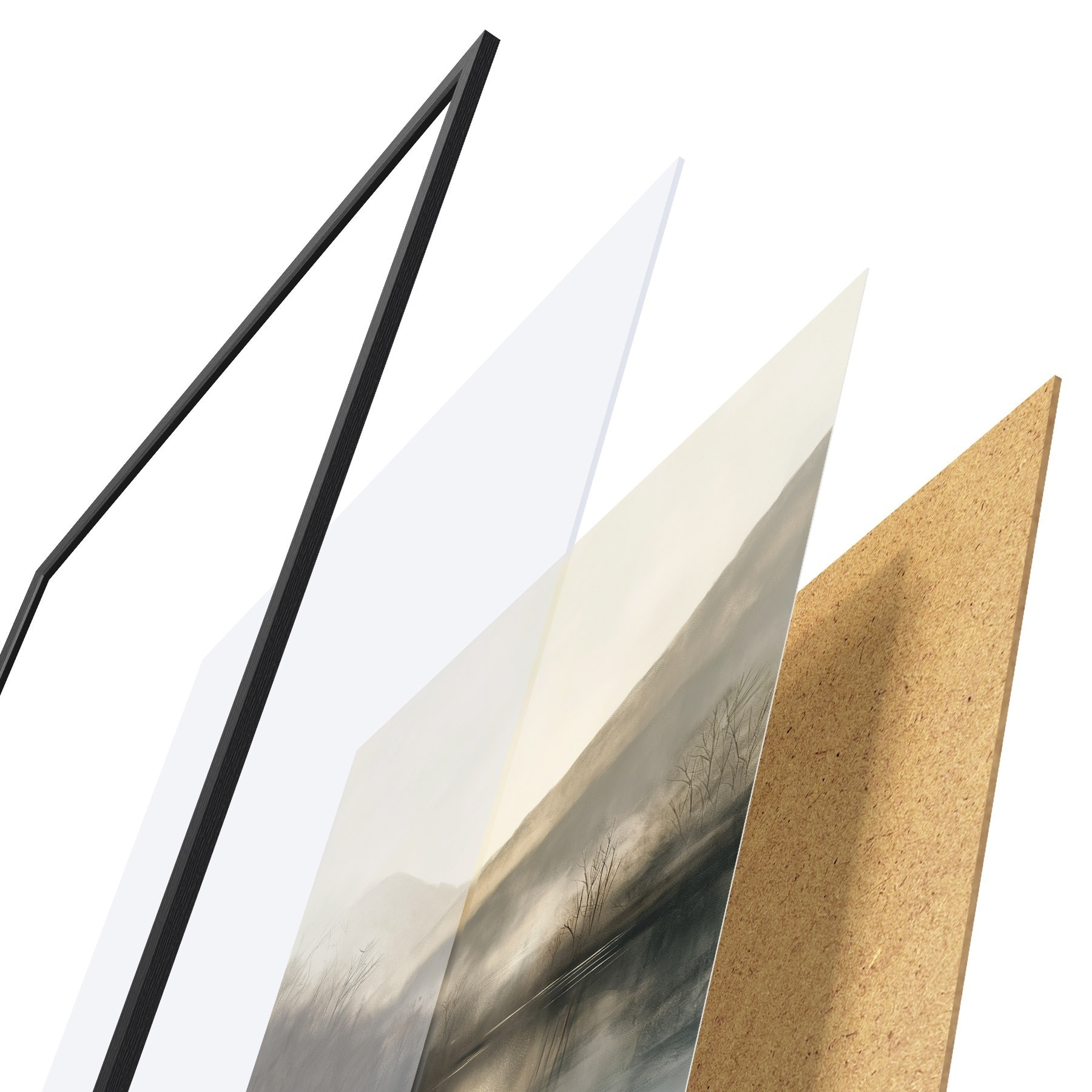 Plagát sa skladá z rámu, plexiskla, vytlačeného obrazu a podkladu z drevotriesky. Plagát možno okamžite zavesiť na stenu vďaka úchytom na zadnej strane.