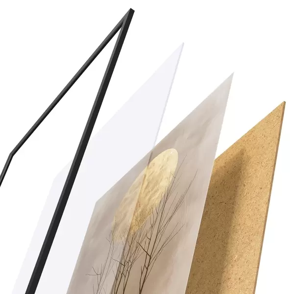Plagát sa skladá z rámu, plexiskla, vytlačeného obrazu a podkladu z drevotriesky. Plagát možno okamžite zavesiť na stenu vďaka úchytom na zadnej strane.