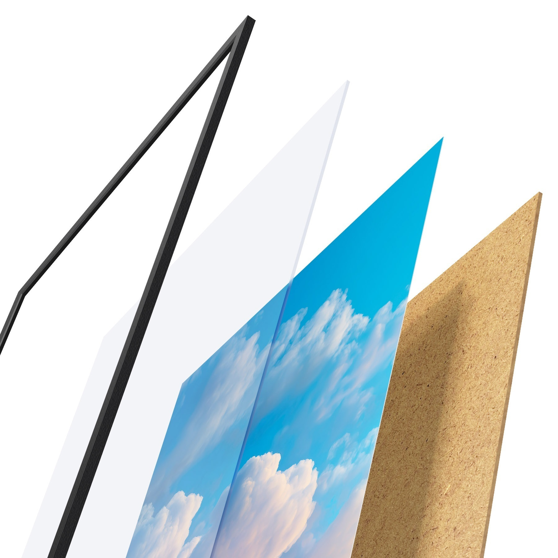 Plagát sa skladá z rámu, plexiskla, vytlačeného obrazu a podkladu z drevotriesky. Plagát možno okamžite zavesiť na stenu vďaka úchytom na zadnej strane.