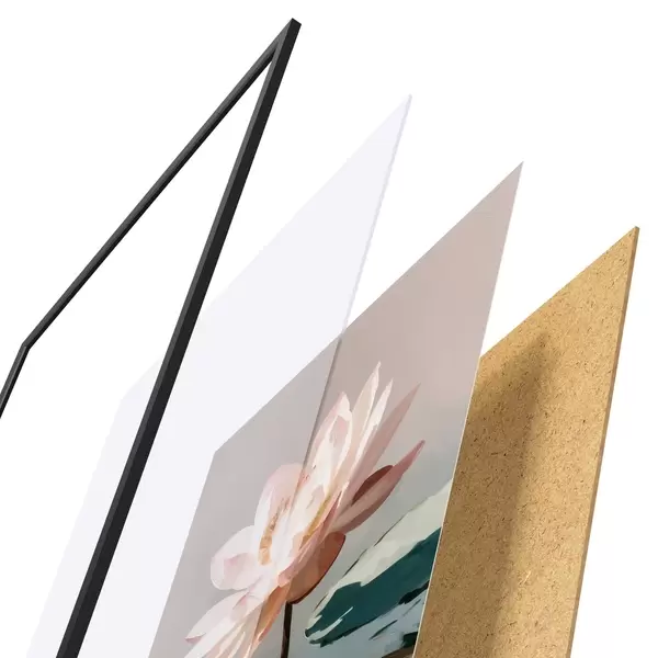 Plagát sa skladá z rámu, plexiskla, vytlačeného obrazu a podkladu z drevotriesky. Plagát možno okamžite zavesiť na stenu vďaka úchytom na zadnej strane.