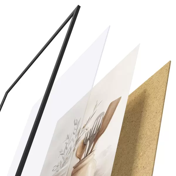 Plagát sa skladá z rámu, plexiskla, vytlačeného obrazu a podkladu z drevotriesky. Plagát možno okamžite zavesiť na stenu vďaka úchytom na zadnej strane.