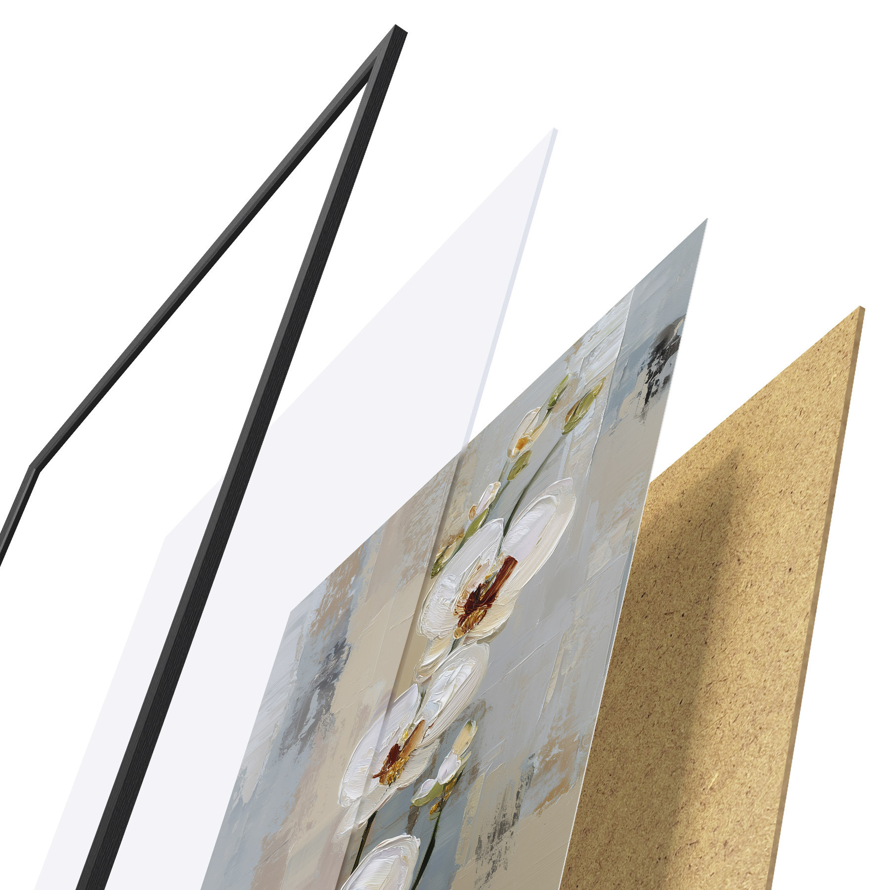Plagát sa skladá z rámu, plexiskla, vytlačeného obrazu a podkladu z drevotriesky. Plagát možno okamžite zavesiť na stenu vďaka úchytom na zadnej strane.