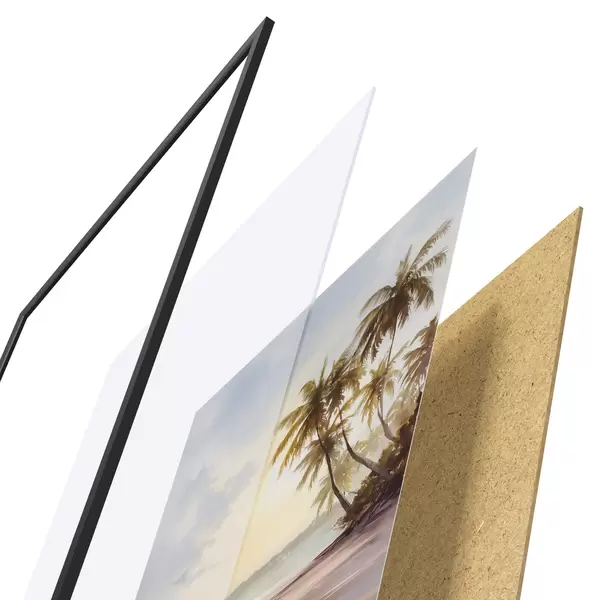Plagát sa skladá z rámu, plexiskla, vytlačeného obrazu a podkladu z drevotriesky. Plagát možno okamžite zavesiť na stenu vďaka úchytom na zadnej strane.