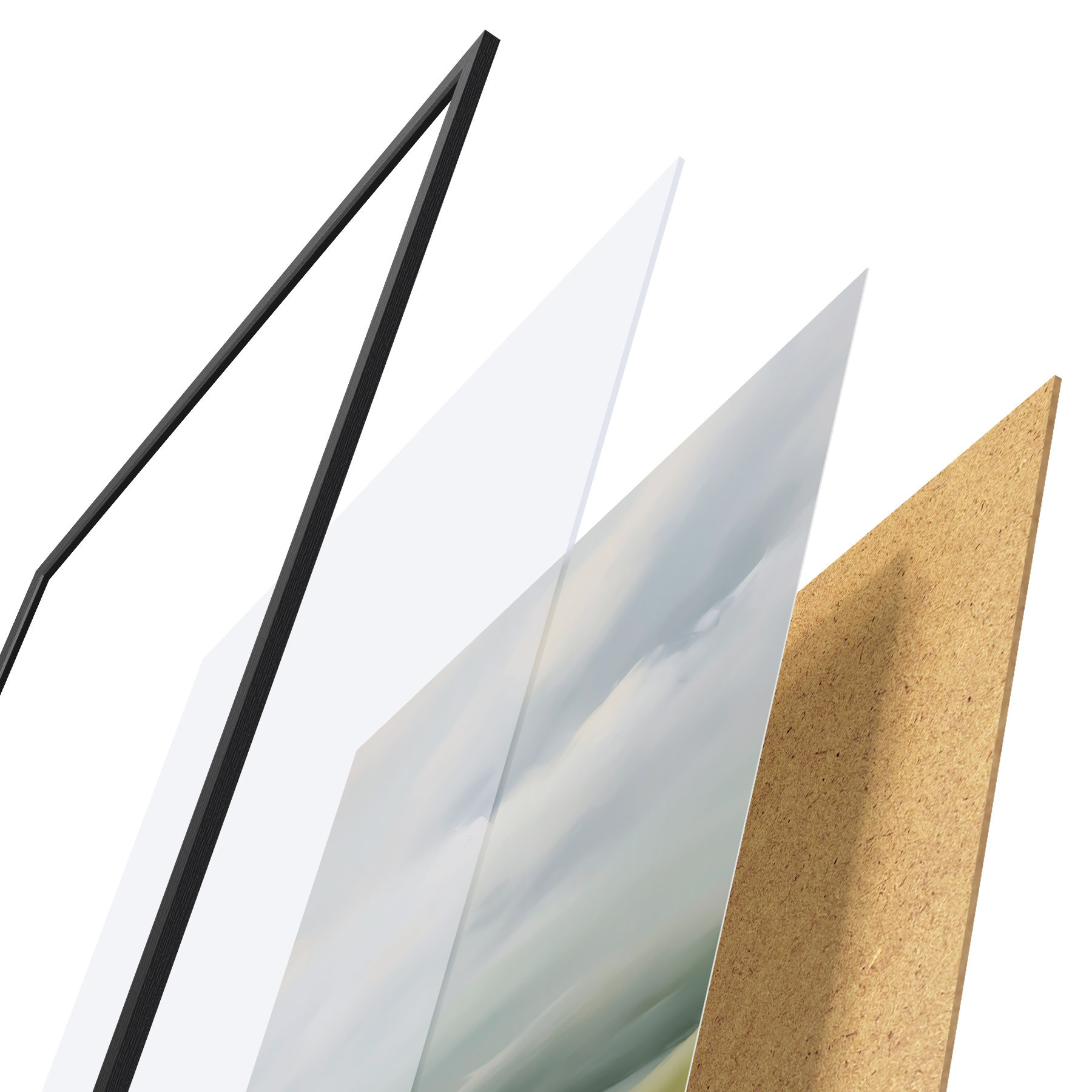 Plagát sa skladá z rámu, plexiskla, vytlačeného obrazu a podkladu z drevotriesky. Plagát možno okamžite zavesiť na stenu vďaka úchytom na zadnej strane.