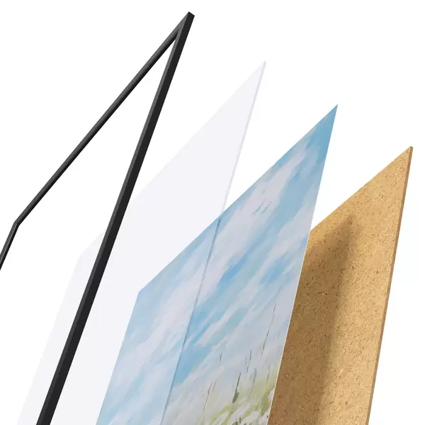 Plagát sa skladá z rámu, plexiskla, vytlačeného obrazu a podkladu z drevotriesky. Plagát možno okamžite zavesiť na stenu vďaka úchytom na zadnej strane.