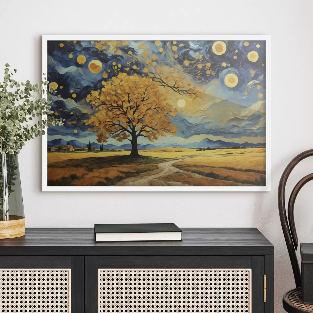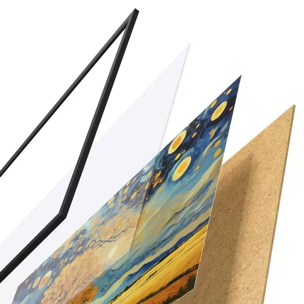 Plagát sa skladá z rámu, plexiskla, vytlačeného obrazu a podkladu z drevotriesky. Plagát možno okamžite zavesiť na stenu vďaka úchytom na zadnej strane.