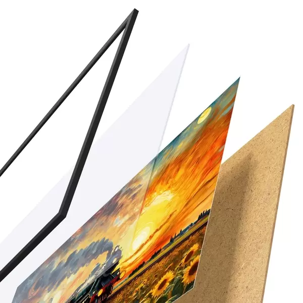 Plagát sa skladá z rámu, plexiskla, vytlačeného obrazu a podkladu z drevotriesky. Plagát možno okamžite zavesiť na stenu vďaka úchytom na zadnej strane.