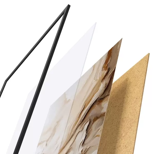 Plagát sa skladá z rámu, plexiskla, vytlačeného obrazu a podkladu z drevotriesky. Plagát možno okamžite zavesiť na stenu vďaka úchytom na zadnej strane.