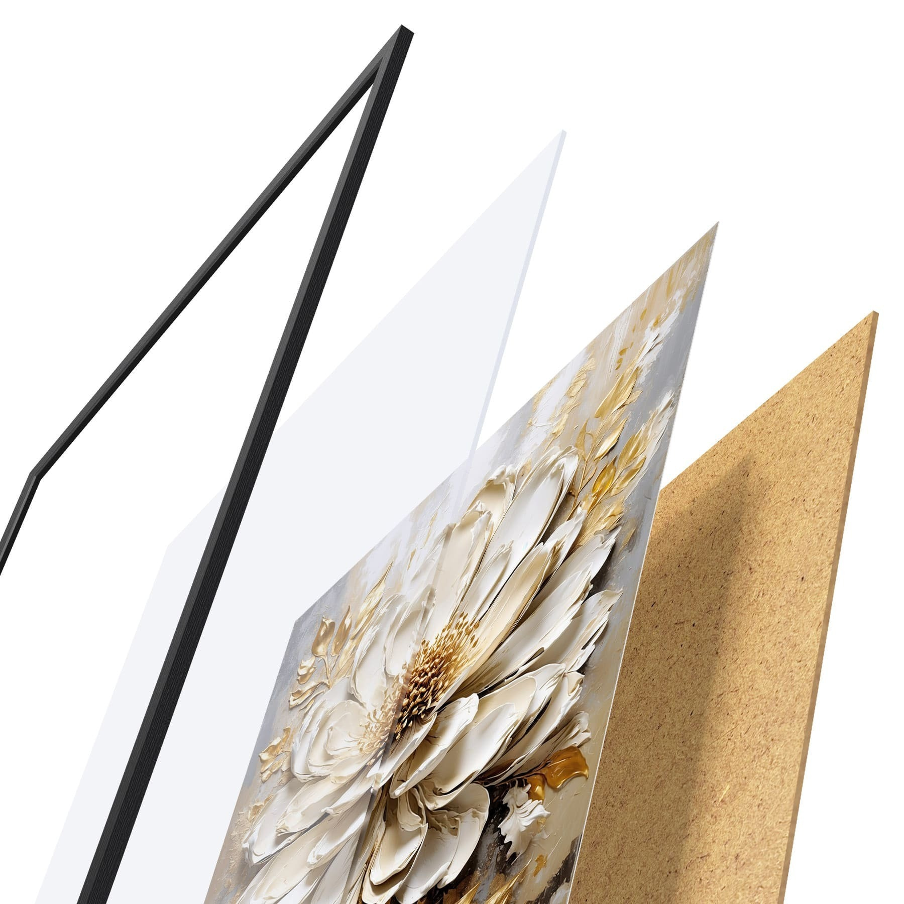 Plagát sa skladá z rámu, plexiskla, vytlačeného obrazu a podkladu z drevotriesky. Plagát možno okamžite zavesiť na stenu vďaka úchytom na zadnej strane.