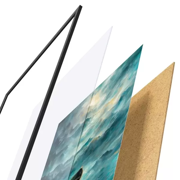 Plagát sa skladá z rámu, plexiskla, vytlačeného obrazu a podkladu z drevotriesky. Plagát možno okamžite zavesiť na stenu vďaka úchytom na zadnej strane.