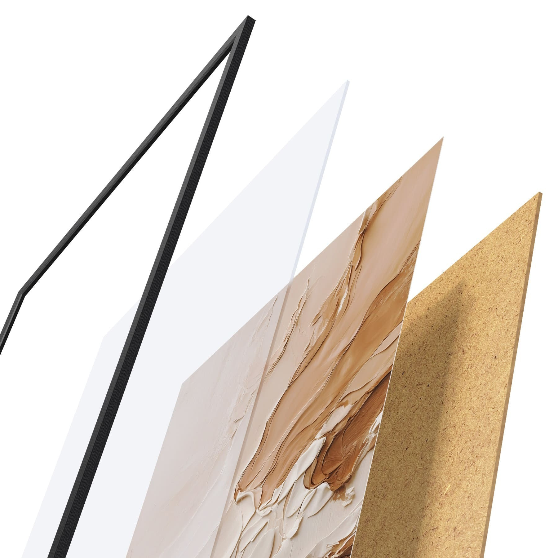 Plagát sa skladá z rámu, plexiskla, vytlačeného obrazu a podkladu z drevotriesky. Plagát možno okamžite zavesiť na stenu vďaka úchytom na zadnej strane.