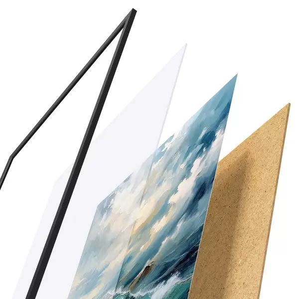 Plagát sa skladá z rámu, plexiskla, vytlačeného obrazu a podkladu z drevotriesky. Plagát možno okamžite zavesiť na stenu vďaka úchytom na zadnej strane.