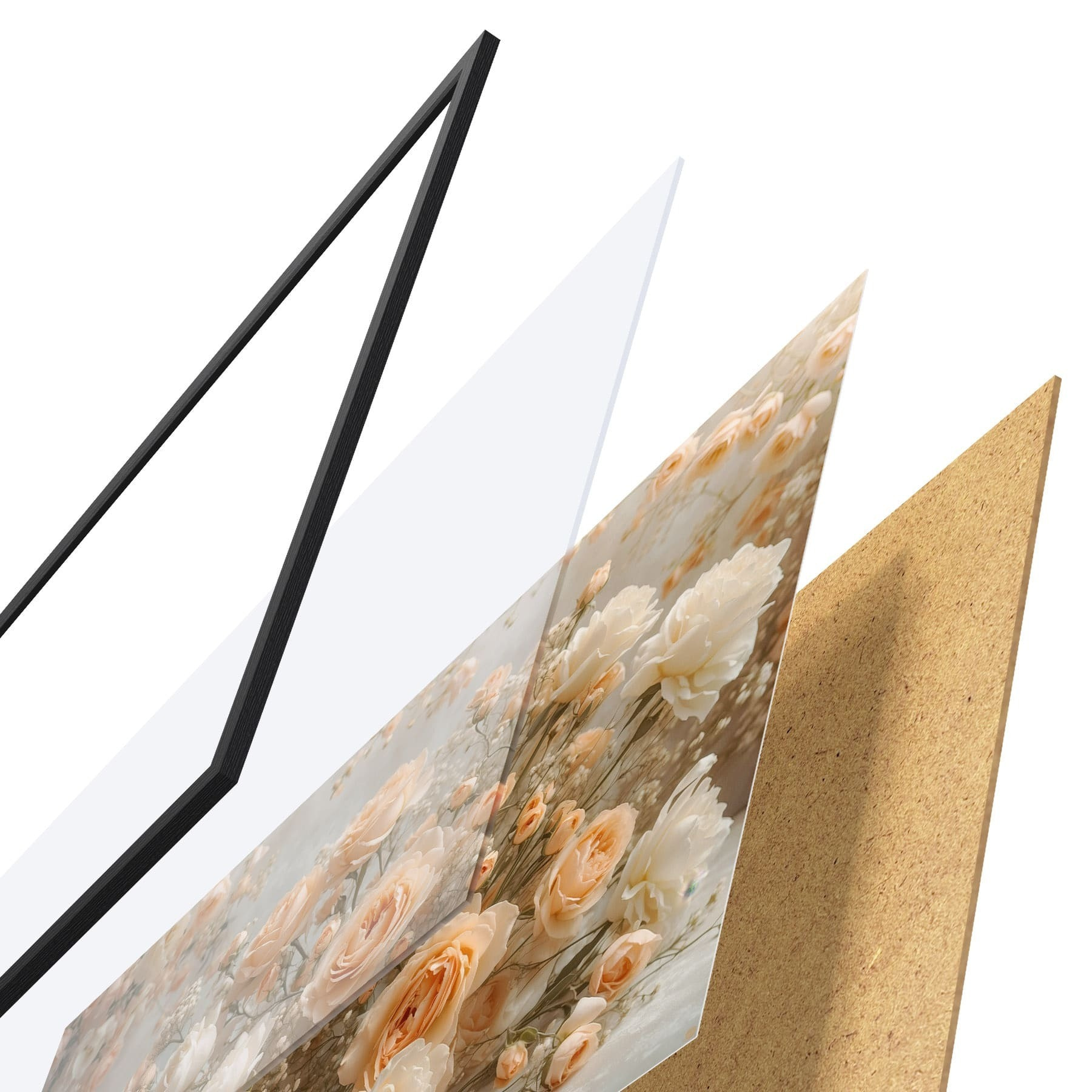 Plagát sa skladá z rámu, plexiskla, vytlačeného obrazu a podkladu z drevotriesky. Plagát možno okamžite zavesiť na stenu vďaka úchytom na zadnej strane.