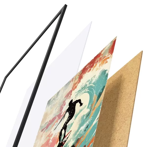Plagát sa skladá z rámu, plexiskla, vytlačeného obrazu a podkladu z drevotriesky. Plagát možno okamžite zavesiť na stenu vďaka úchytom na zadnej strane.