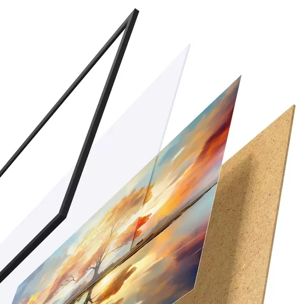 Plagát sa skladá z rámu, plexiskla, vytlačeného obrazu a podkladu z drevotriesky. Plagát možno okamžite zavesiť na stenu vďaka úchytom na zadnej strane.