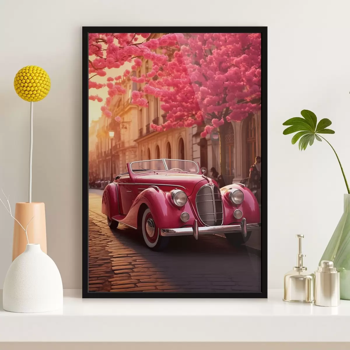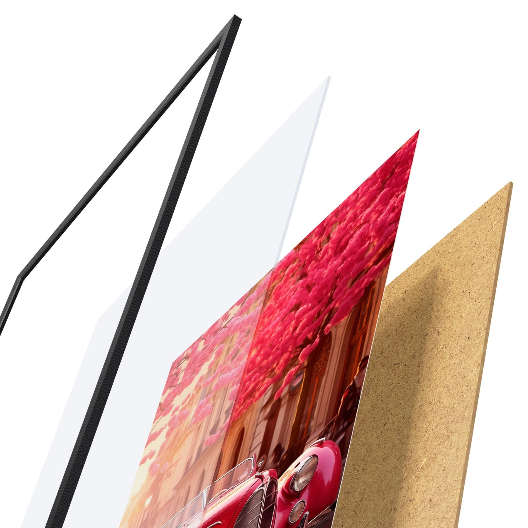 Plagát sa skladá z rámu, plexiskla, vytlačeného obrazu a podkladu z drevotriesky. Plagát možno okamžite zavesiť na stenu vďaka úchytom na zadnej strane.