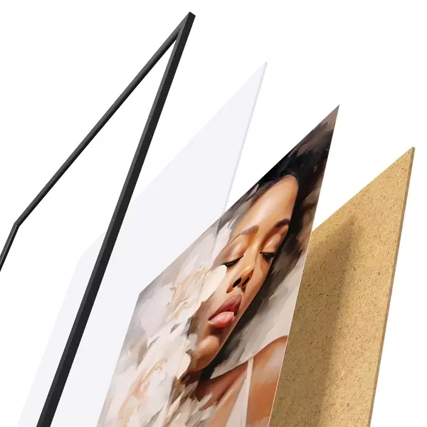 Plagát sa skladá z rámu, plexiskla, vytlačeného obrazu a podkladu z drevotriesky. Plagát možno okamžite zavesiť na stenu vďaka úchytom na zadnej strane.