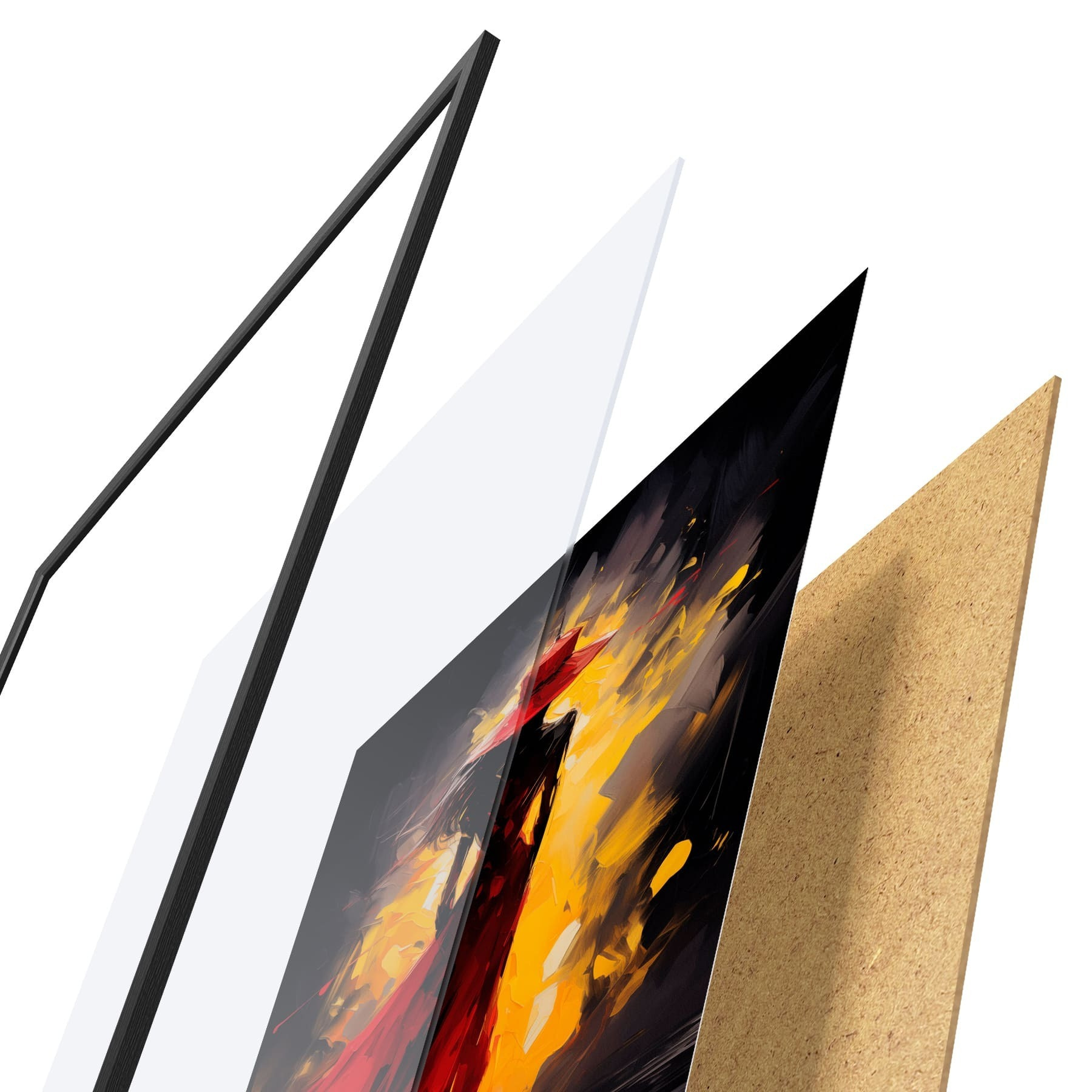 Plagát sa skladá z rámu, plexiskla, vytlačeného obrazu a podkladu z drevotriesky. Plagát možno okamžite zavesiť na stenu vďaka úchytom na zadnej strane.