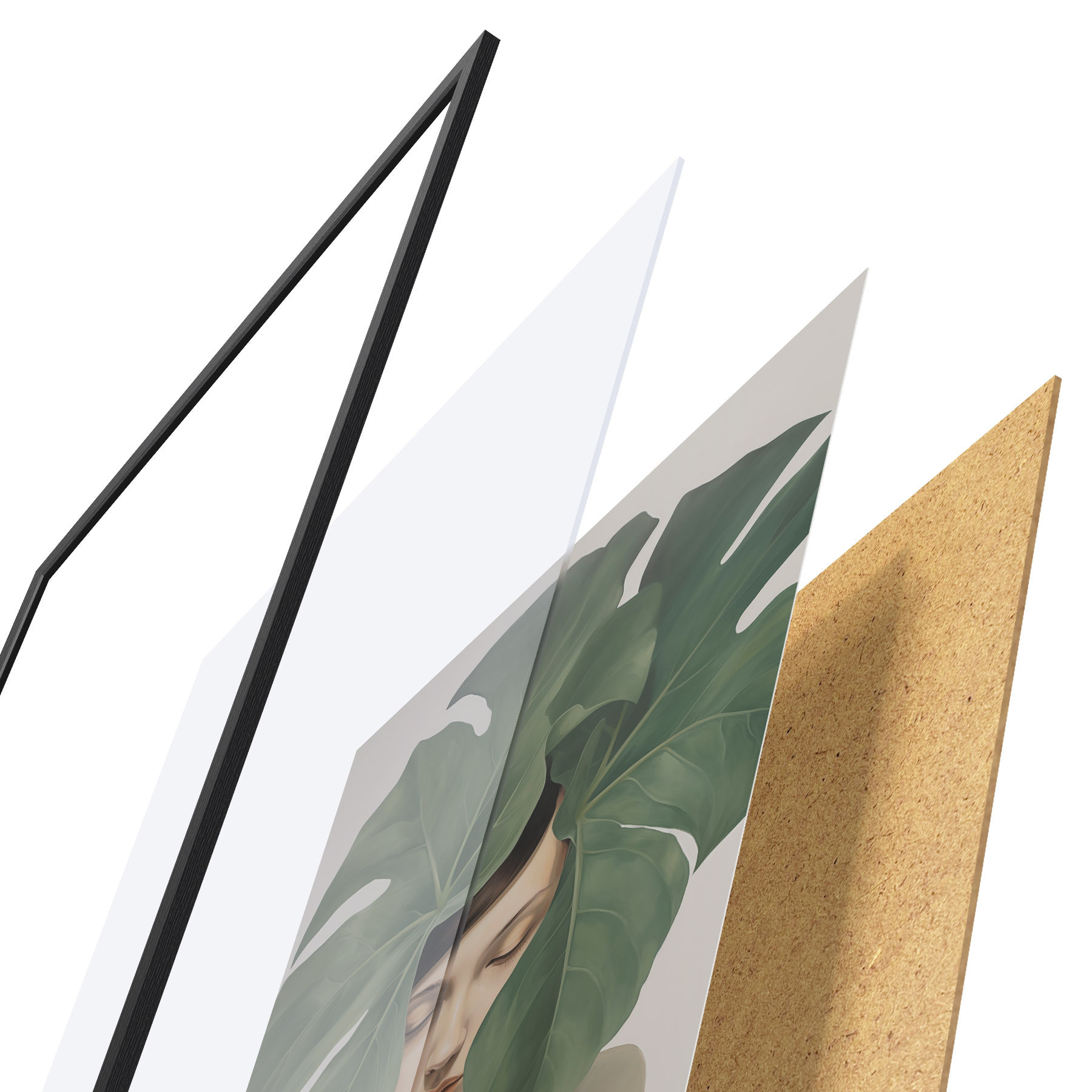 Plagát sa skladá z rámu, plexiskla, vytlačeného obrazu a podkladu z drevotriesky. Plagát možno okamžite zavesiť na stenu vďaka úchytom na zadnej strane.