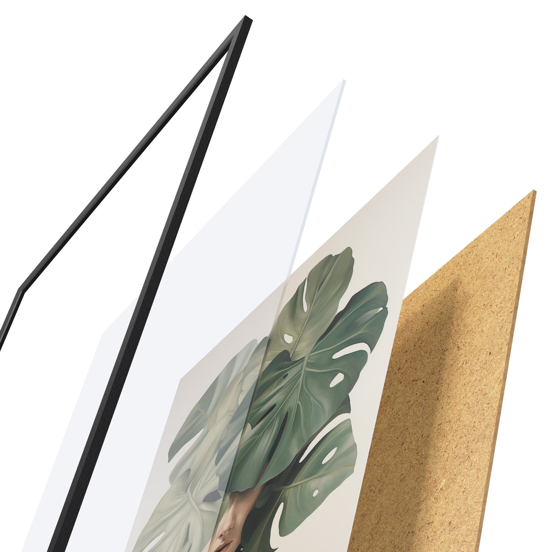 Plagát sa skladá z rámu, plexiskla, vytlačeného obrazu a podkladu z drevotriesky. Plagát možno okamžite zavesiť na stenu vďaka úchytom na zadnej strane.
