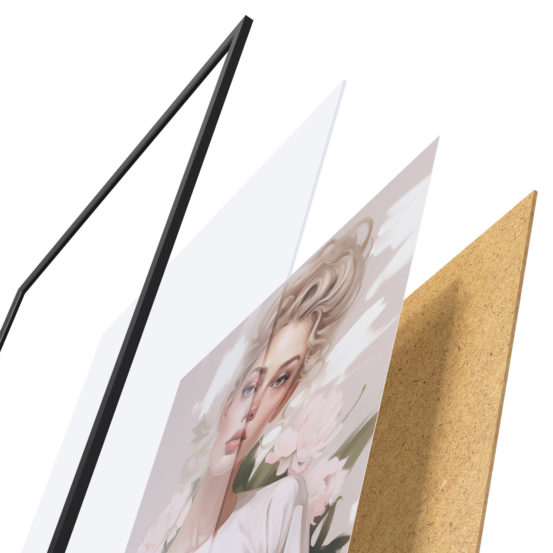 Plagát sa skladá z rámu, plexiskla, vytlačeného obrazu a podkladu z drevotriesky. Plagát možno okamžite zavesiť na stenu vďaka úchytom na zadnej strane.