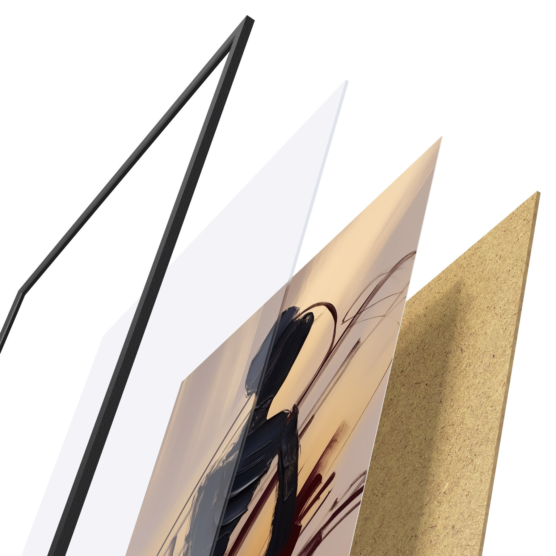 Plagát sa skladá z rámu, plexiskla, vytlačeného obrazu a podkladu z drevotriesky. Plagát možno okamžite zavesiť na stenu vďaka úchytom na zadnej strane.